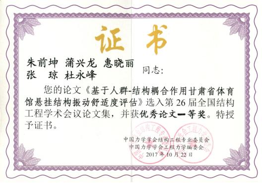 由中国力学学会结构工程专业委员会、《工程力学》编委会、中南大学等单位共同举办的第26届全国结构工程学术会议,于2017年10月21日至10月22日在中南大学成功举行。根据论文的学术性、应用性和作者的口头宣读水平,经评审专家评选,我校杜永峰教团队的青年教师朱前坤博士宣读的论文《基于人群-结构耦合作用甘肃省体育馆悬挂结构振动舒适度评估》获优秀论文一等奖。