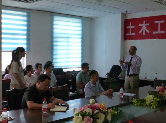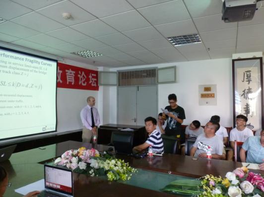 本次结题报告中,Fernando Moreu首先介绍了自己赴我校防震减灾研究所承担的风电塔筒疲劳监测、大跨度楼盖振动监测等模型试验现场和西固妇幼保健医院隔震工程工地考察的情况。接下来,Moreu博士还介绍了他在美国UIUC攻读博士学位期间以及在现在的学校工作期间对某铁路桥梁施工期振动的现场观测结果及视频等,报告直观生动。Moreu博士不但对无线传感技术应用有独到的见解,而且主动给青年教师、研究生提出问题,共大家讨论。此外,为了充分发挥“双新”基金短期访问学者的作用,还安排我校双语课学员与Moreu博士用英语交流海外大学日常科研工作,为我校土木工程双语教学和大学生国际交流意识培养做了有益探索。