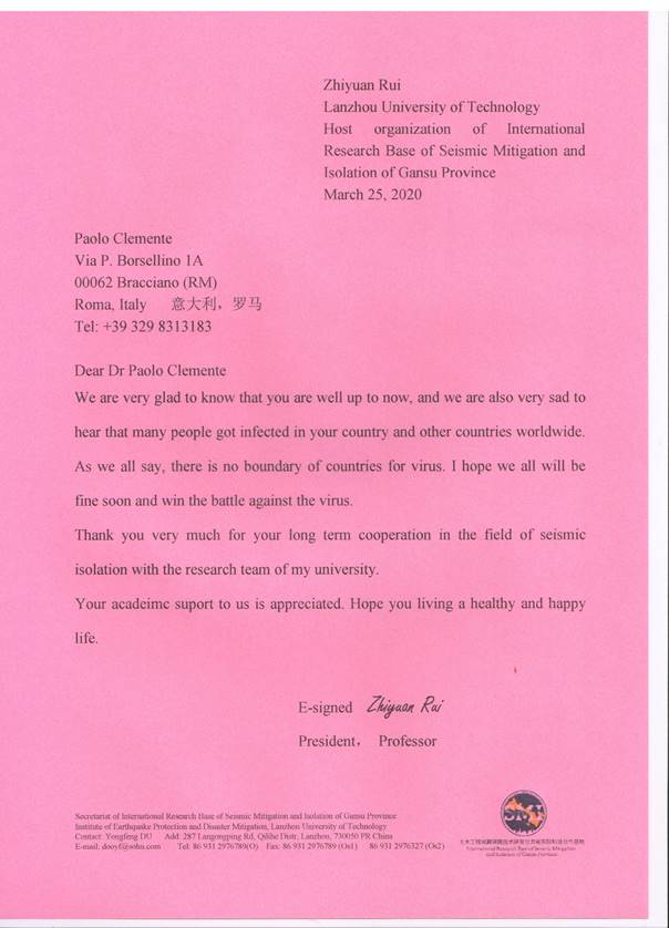 近一段时间以来,新冠疫情在全球多个国家蔓延。一批担任兰州理工大学甘肃省土木工程减震隔震国际科技合作基地第一届学术委员的专家所在国家也受到疫情困扰,防护用品特别缺乏,生活极为不便。我校党委夏天东书记、芮执元校长了解到专家们困难,委托减隔震国合基地管理团队立即给予援助,先后向疫情较为严重的意大利、美国、日本、英国、韩国、塞尔维亚等国家的外籍委员寄送了防护物资。芮执元校长还代表基地依托单位,给20多位与我校长期合作的专家签发了热情洋溢的慰问信和回顾学校防震减灾研究团队与专家长期合作的照片资料,表达对专家长期支持的感恩。