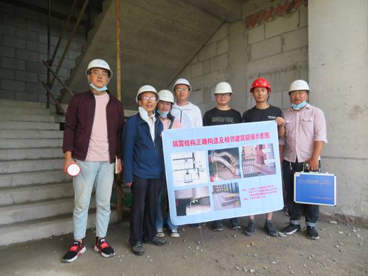 调研小组给工地技术人员发放隔震构造提示牌 (成县某妇幼医院工地)