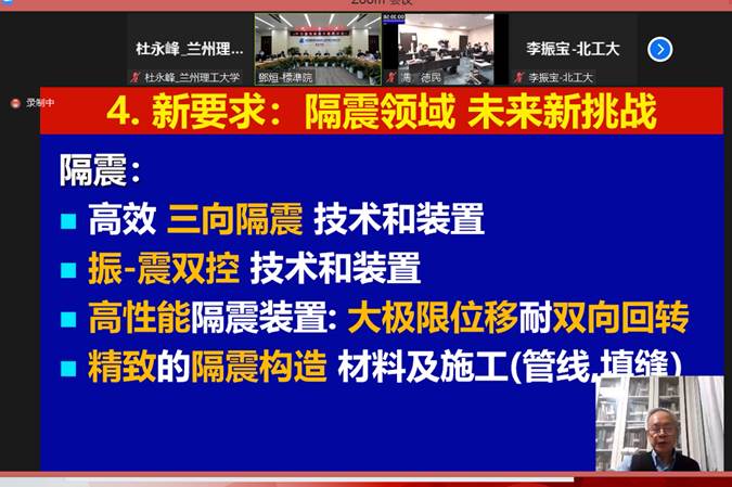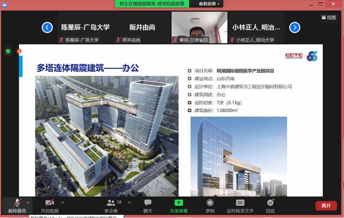 除了专家们就中日两国近年来隔震技术研究和应用进展做学术报告外,会议还讨论了即将于2023年举办的第十四届中日建筑结构技术交流会的有关事宜。兰州理工大学作为该系列学术会议的十三届承办单位,本次应邀参与这次线上研讨交流会,土木工程减震隔震技术研发甘肃省国际科技合作基地负责人、中日建筑结构技术交流委员会副会长杜永峰教授代表我校省减隔震国际合作基地向参会专家简短致辞。