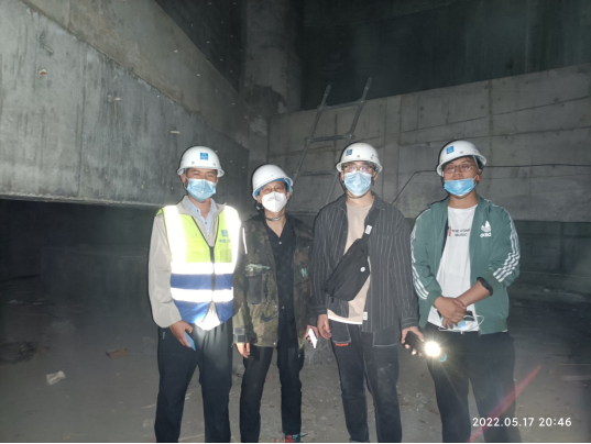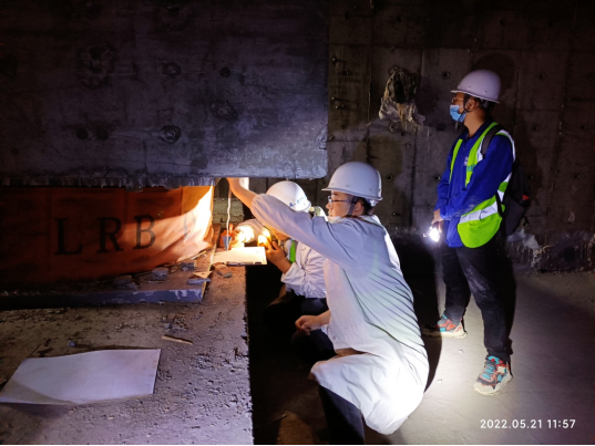 技术服务小组的部分研究生成员在隔震层核实变形