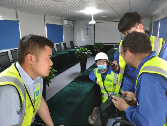 技术服务小组的部分成员和工地技术人员在工地会议室试用远程监测